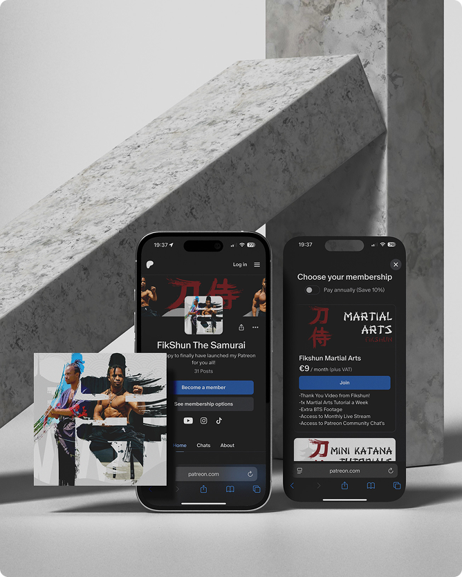 FikShun wanted a Patreon presence that felt as dynamic, disciplined, and creative as his artistry. The goal was to craft a visual identity that captured his dual persona, dancer and martial artist, while giving his fans a polished, immersive experience. I focused on building a style that felt bold, cinematic, and unmistakably “FikShun.”