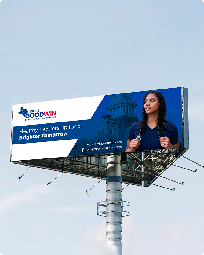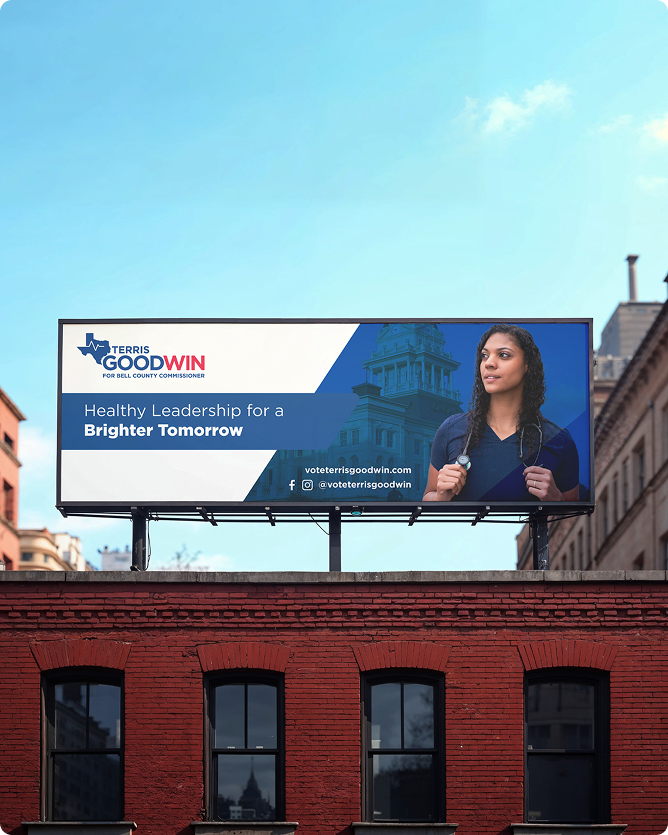The campaign assets were optimized for both scale and clarity, ensuring high impact across public spaces. The refreshed visuals elevated Terris Goodwin’s public profile, making her message clear, professional, and instantly recognizable.